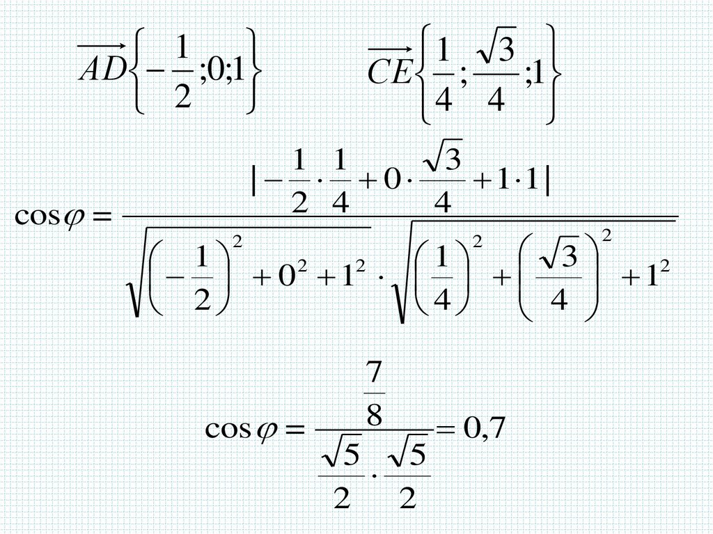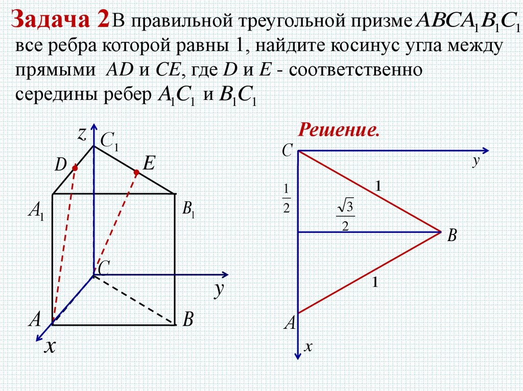 Задача 2 В правильной треугольной призме ABCA1B1C1все ребра которой равны 1, найдите косинус угла между