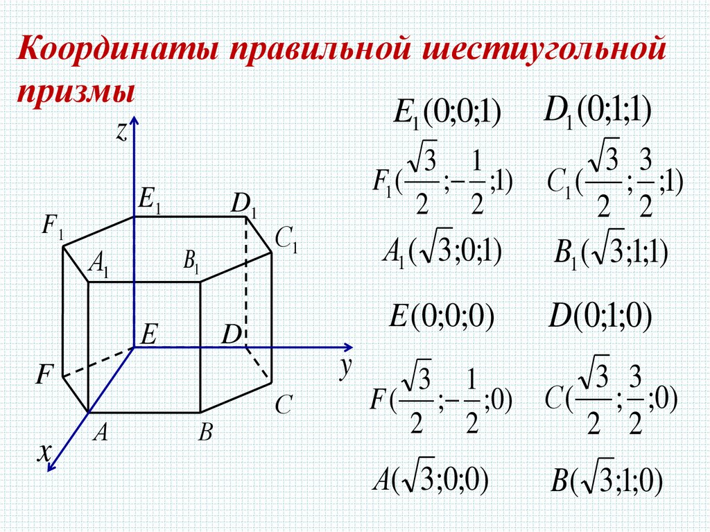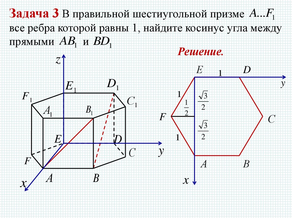 Задача 3 В правильной шестиугольной призме A...F1все ребра которой равны 1, найдите косинус угла между