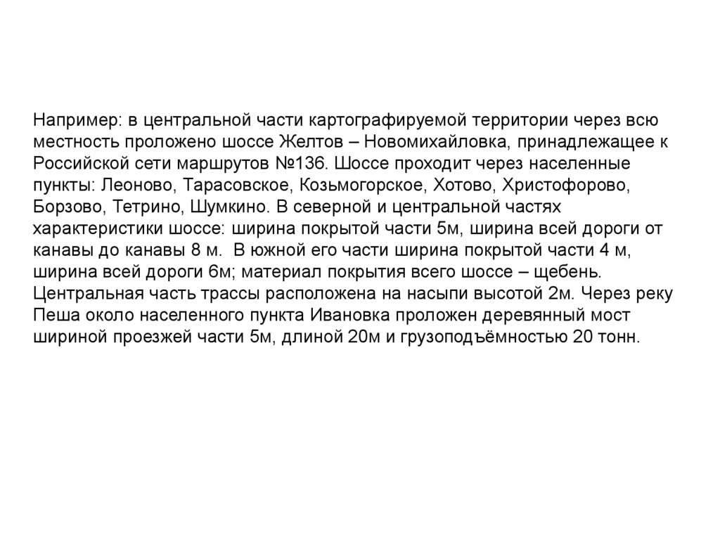 Например: в центральной части картографируемой территории через всюместность проложено шоссе Желтов – Новомихайловка, принадлежащее к