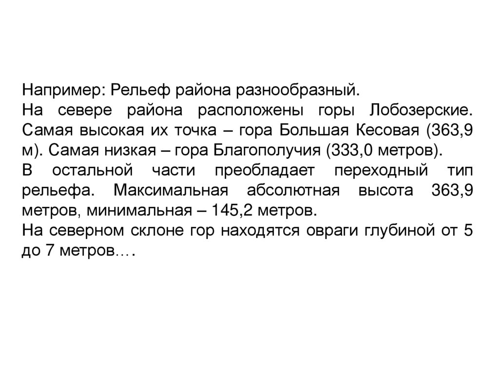 Например: Рельеф района разнообразный.На севере района расположены горы Лобозерские.