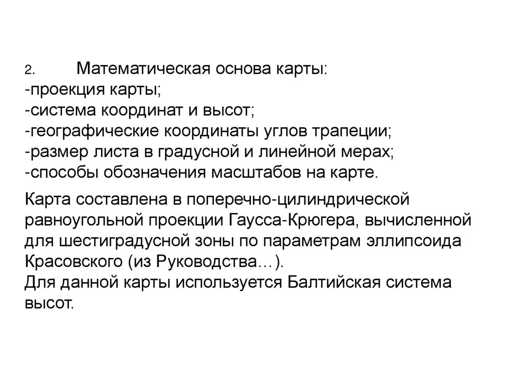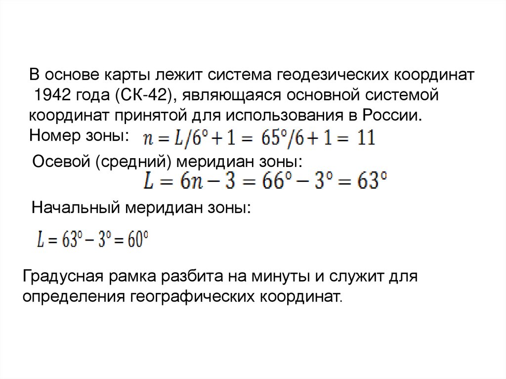 В основе карты лежит система геодезических координат1942 года (СК-42), являющаяся основной системой