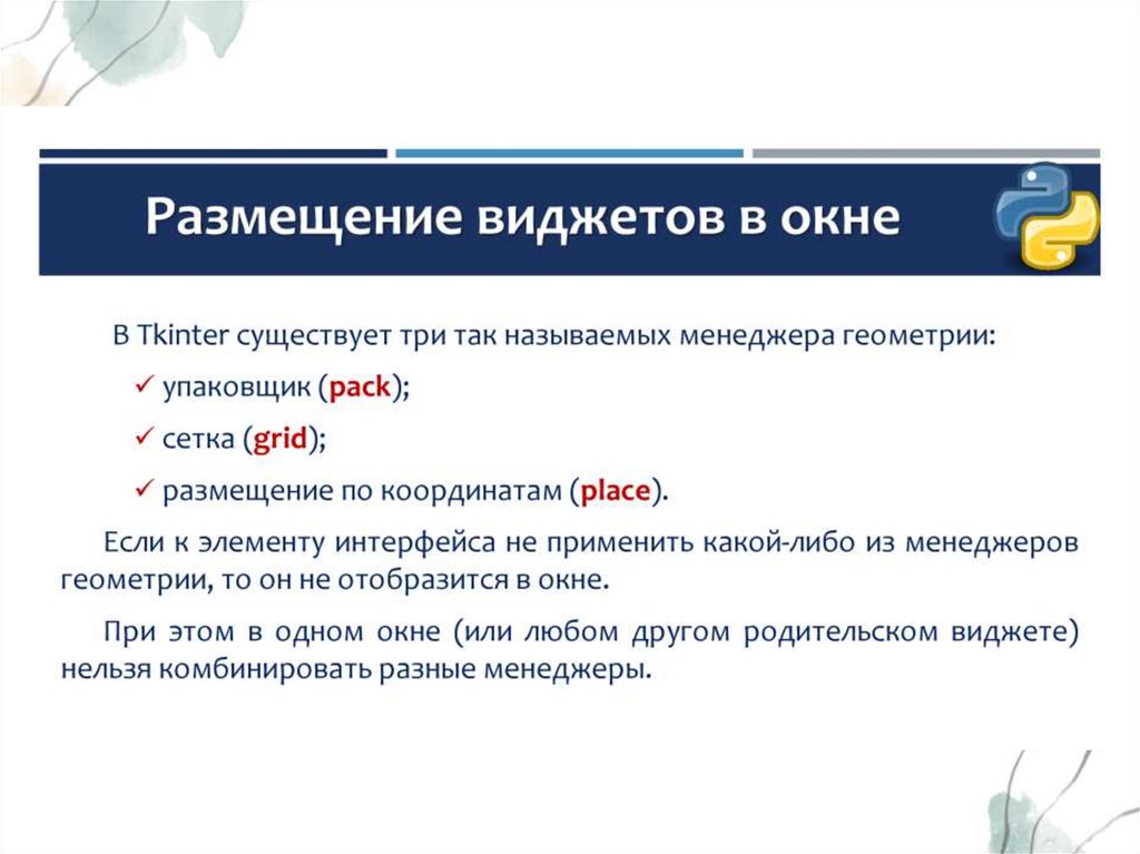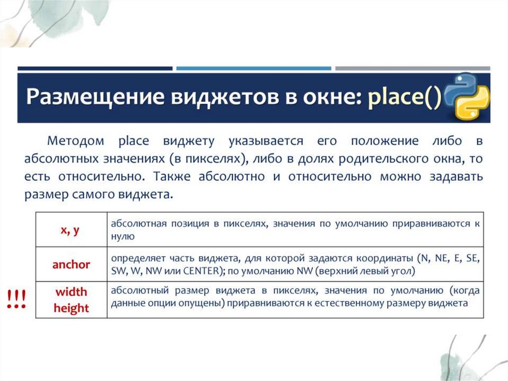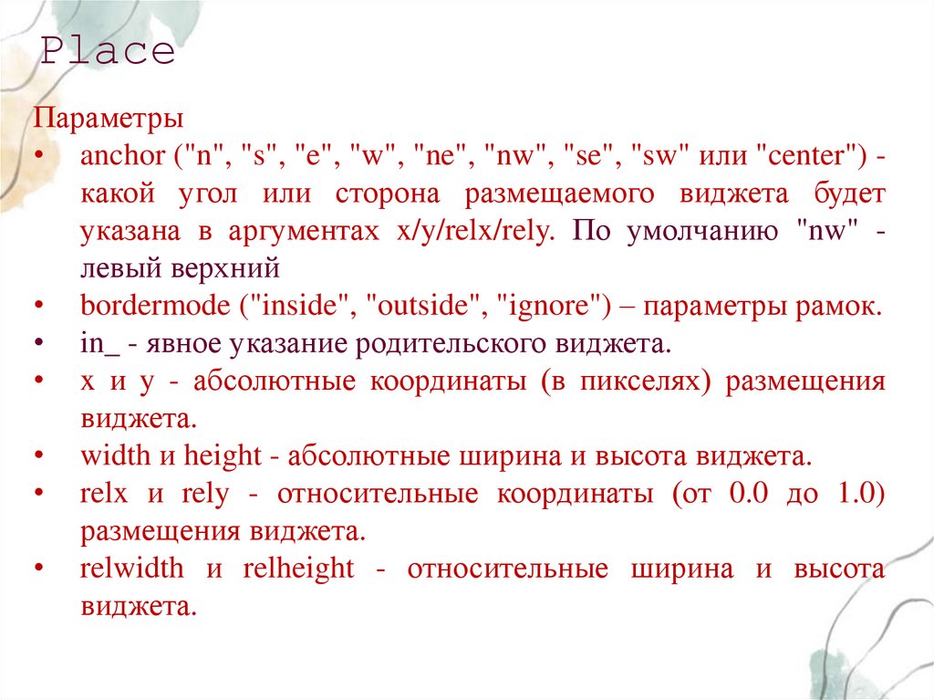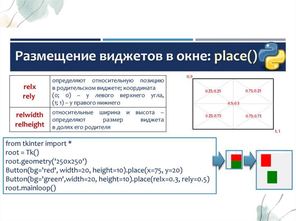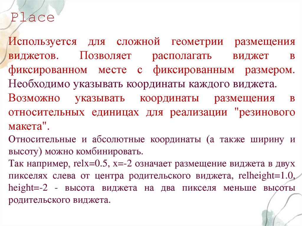 Так например, relx=0.5, x=-2 означает размещение виджета в двух