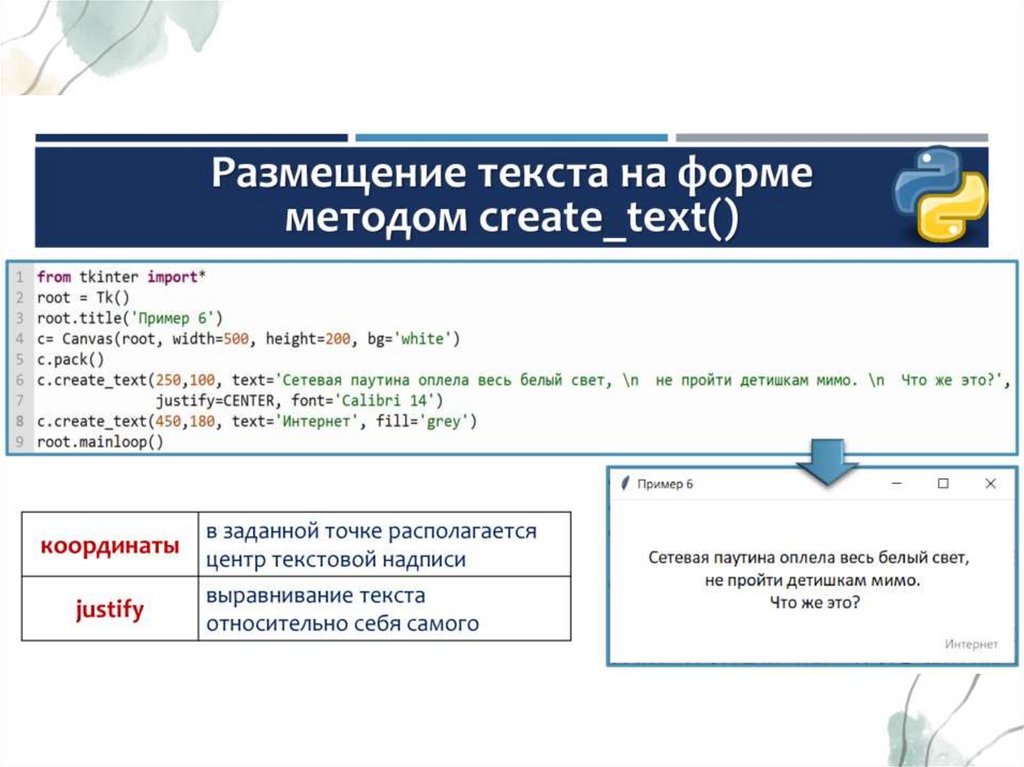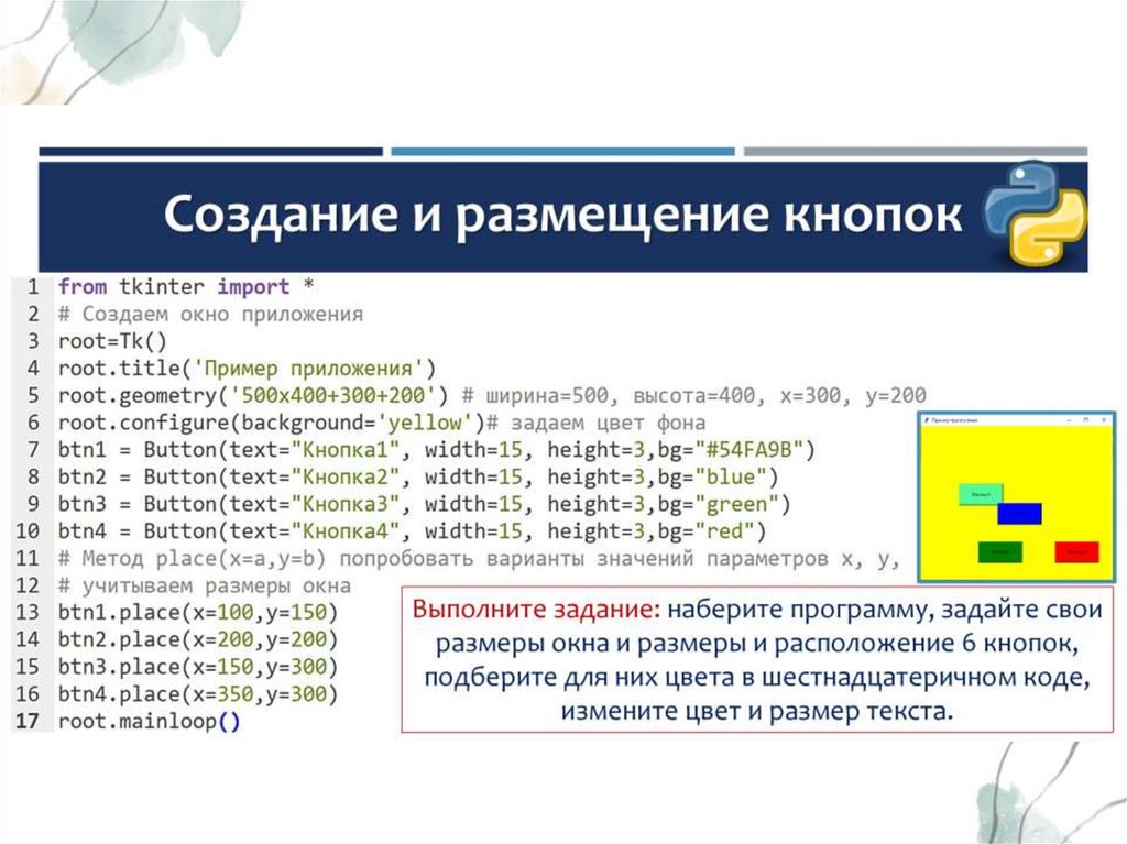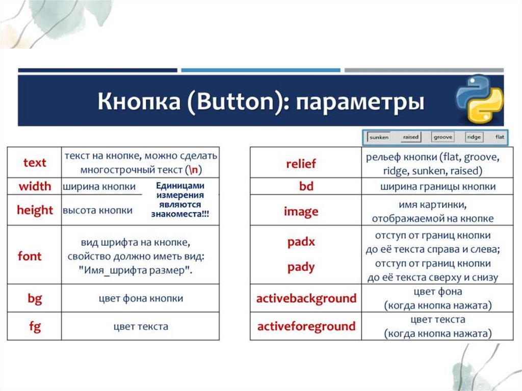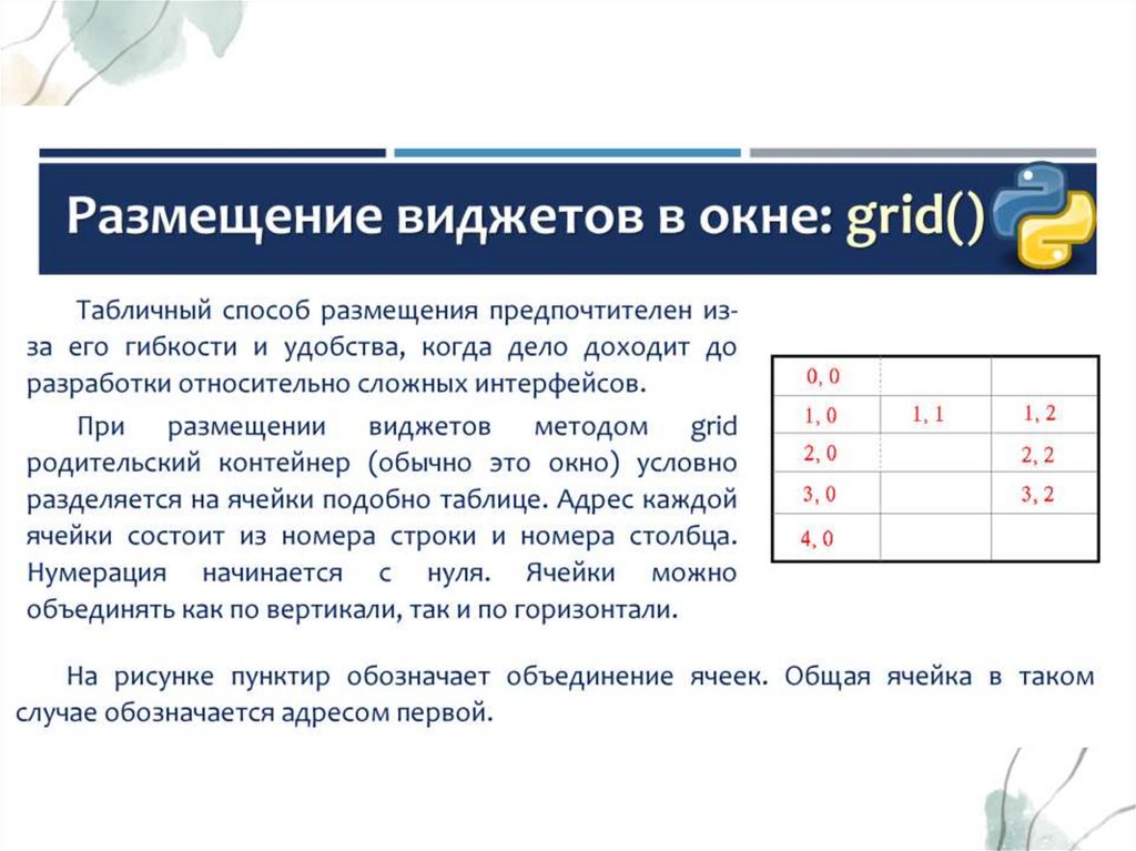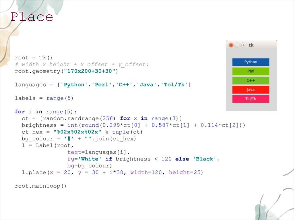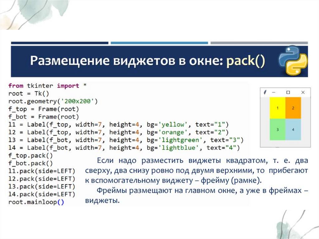 Так например, relx=0.5, x=-2 означает размещение виджета в двух