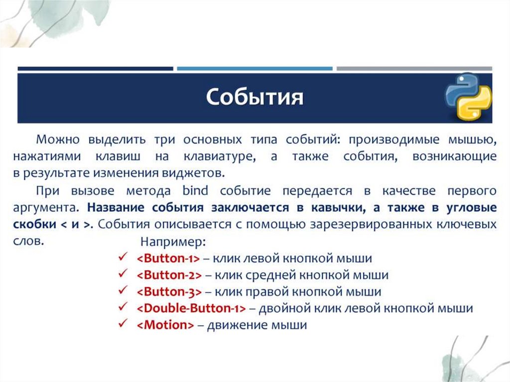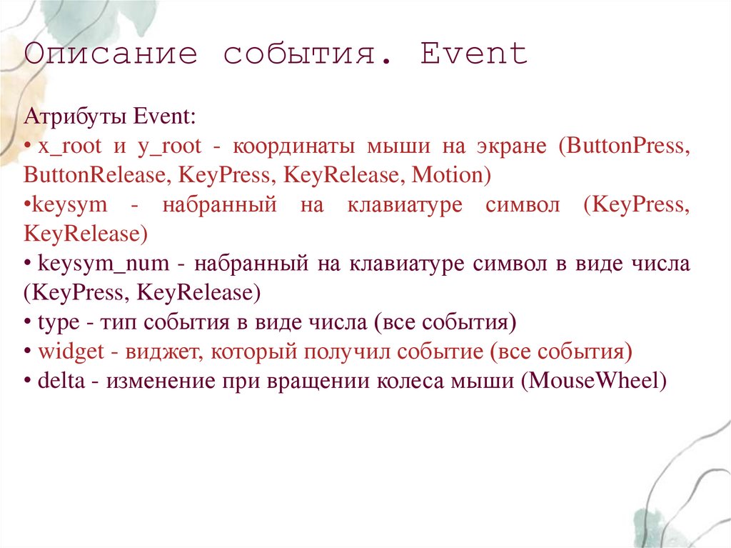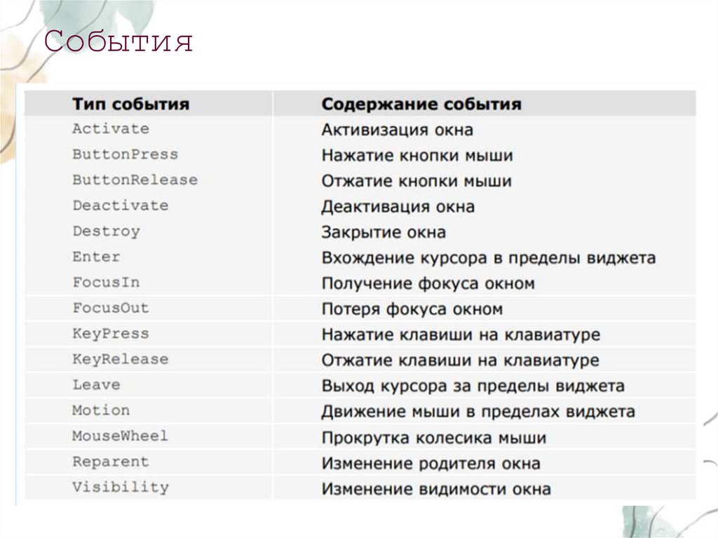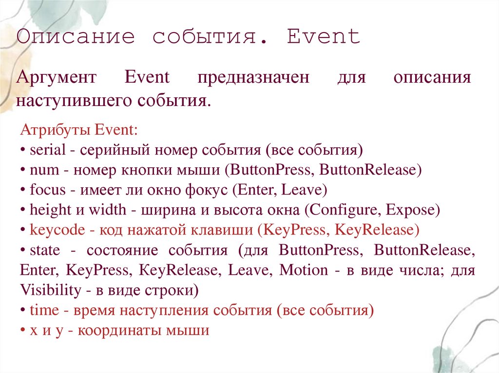 Enter, KeyPress, КeyRelease, Leave, Motion - в виде числа; для