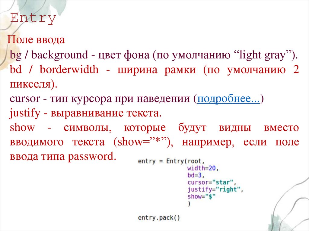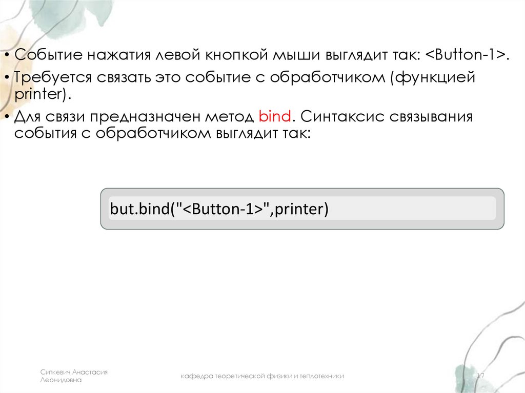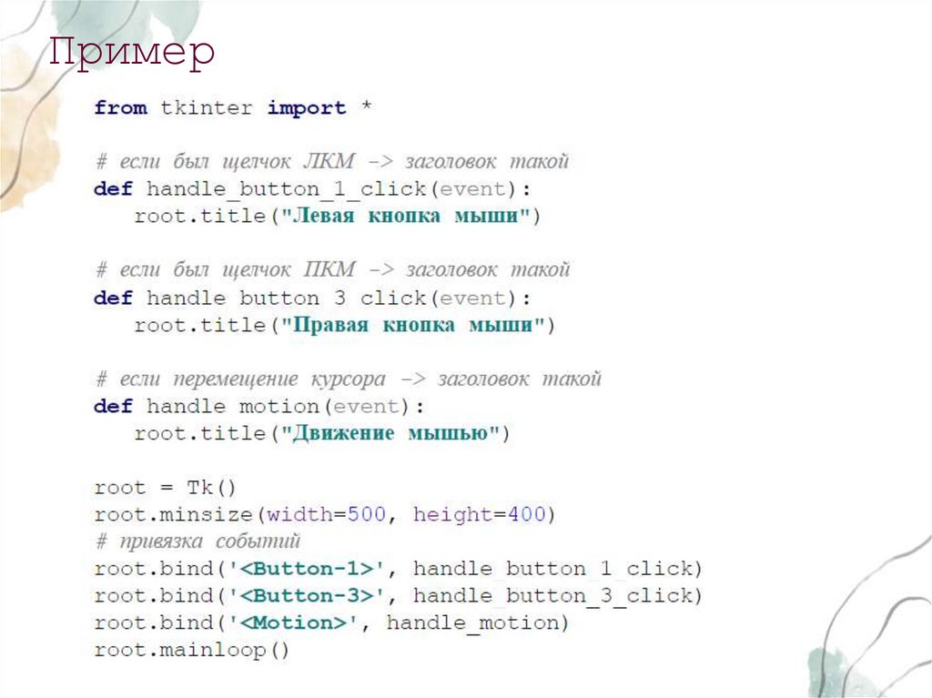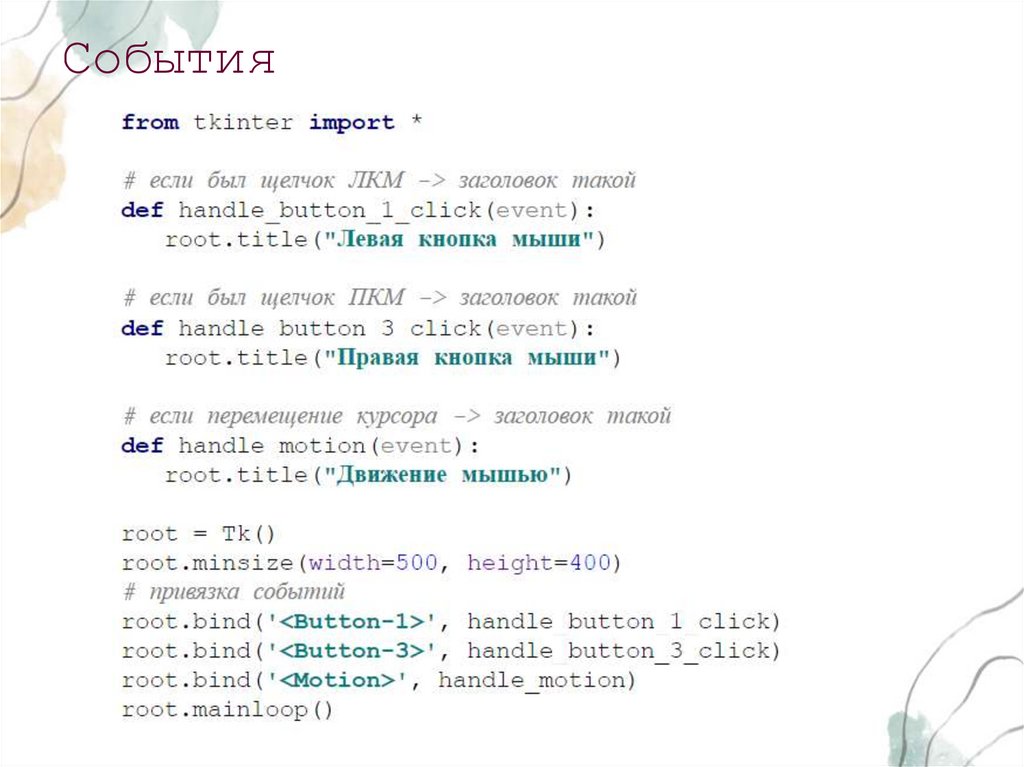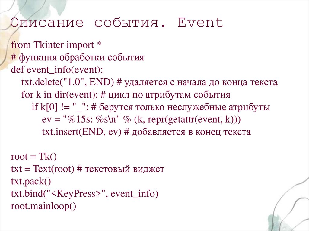 Enter, KeyPress, КeyRelease, Leave, Motion - в виде числа; для