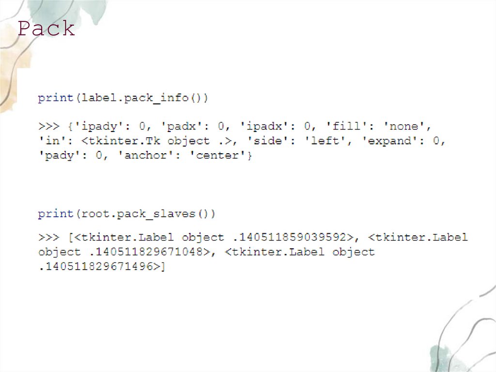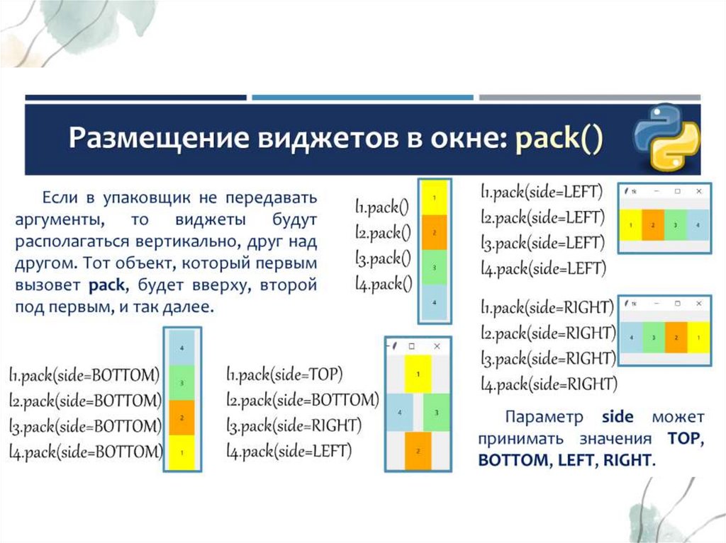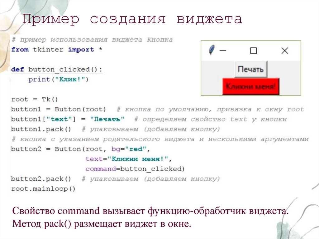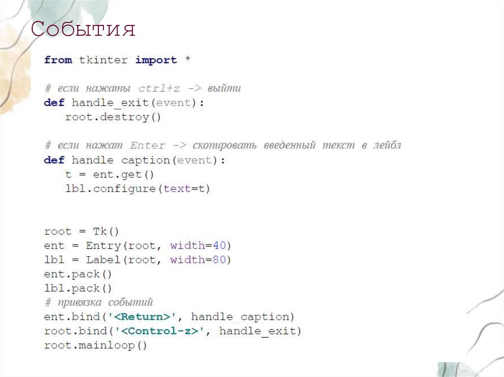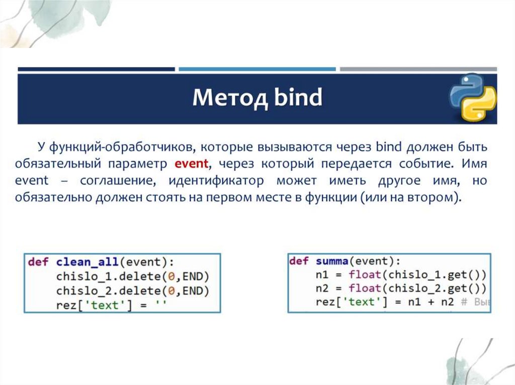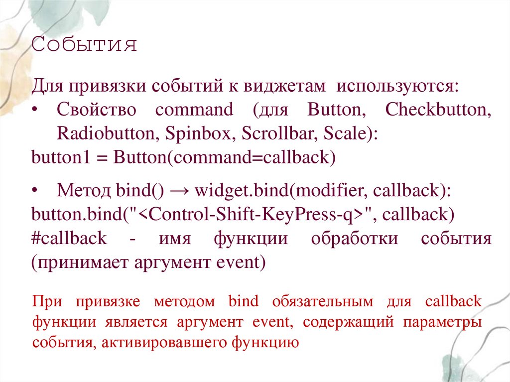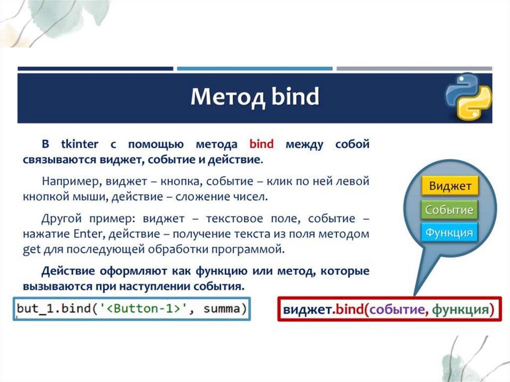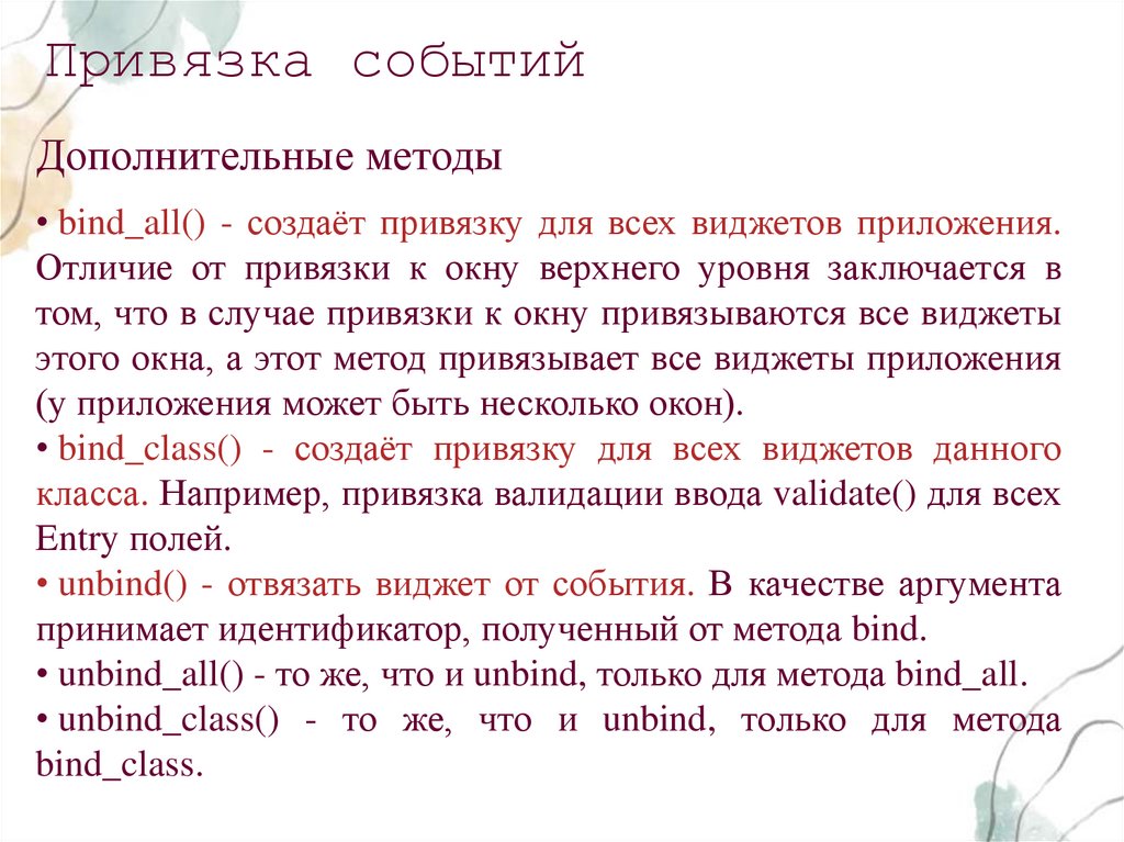 • bind_all() - создаёт привязку для всех виджетов приложения.