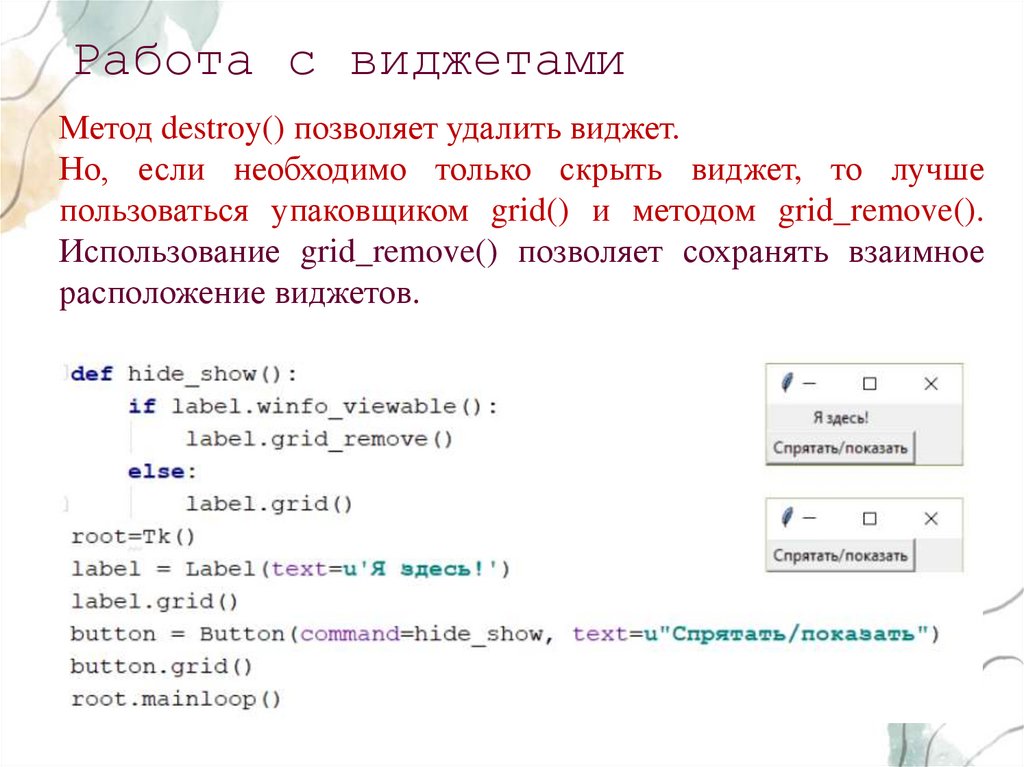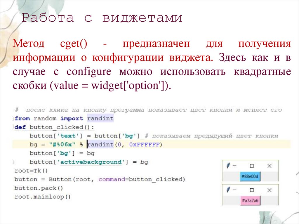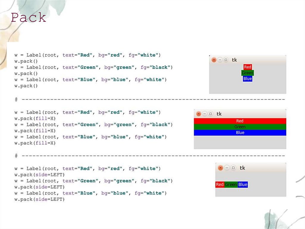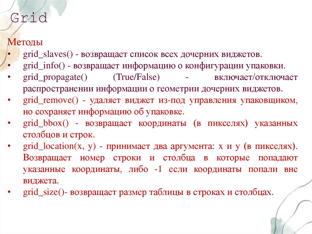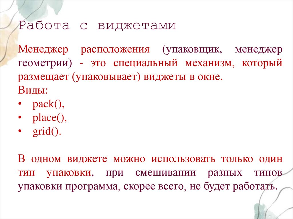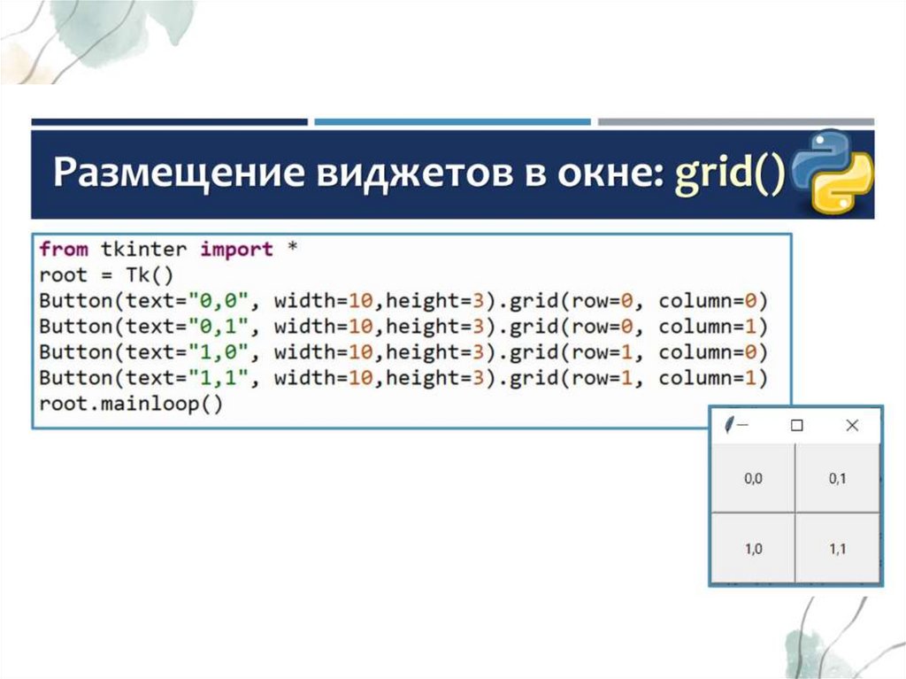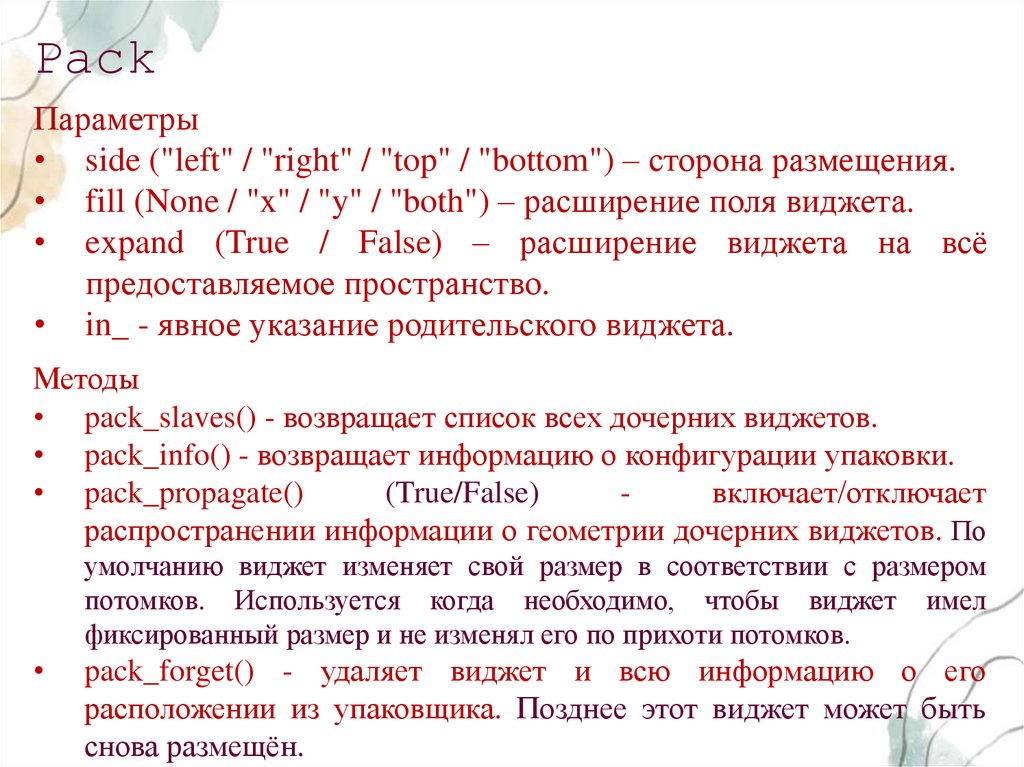 • bind_all() - создаёт привязку для всех виджетов приложения.