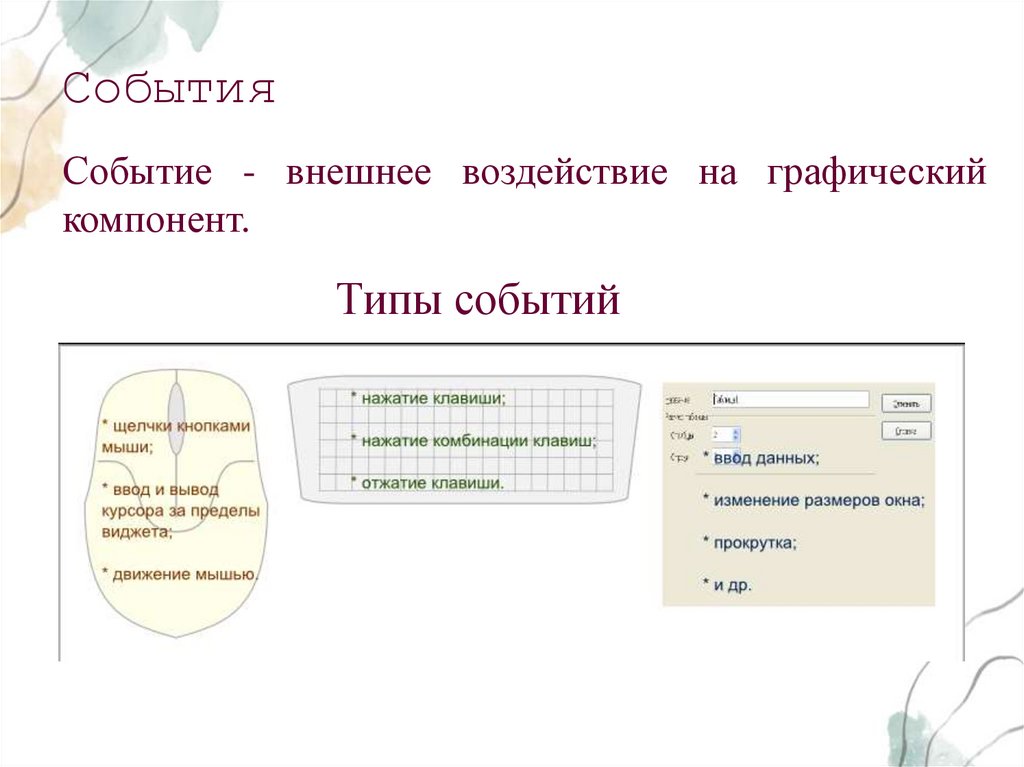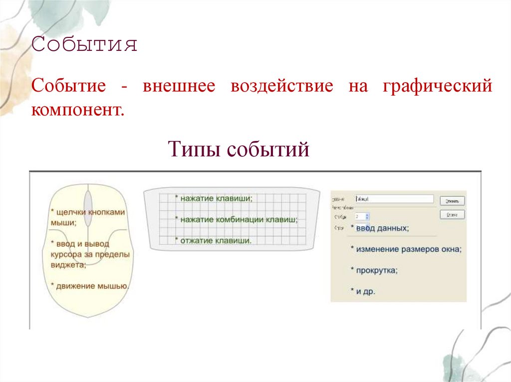Примеры событий: ввод с клавиатуры, перемещениеуказателя или нажатие кнопки мыши и т.д.