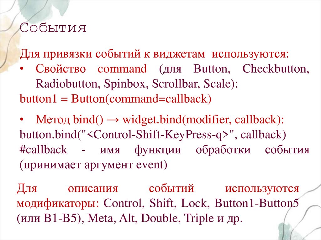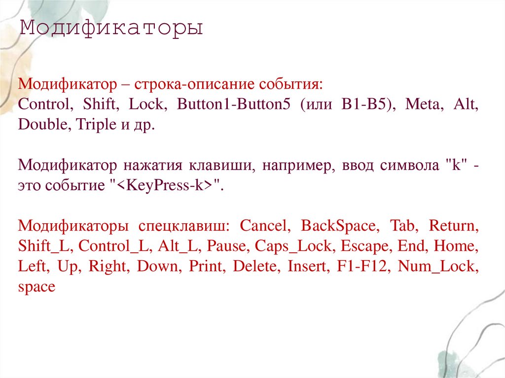 Модификатор нажатия клавиши, например, ввод символа "k" это событие "<KeyPress-k>".