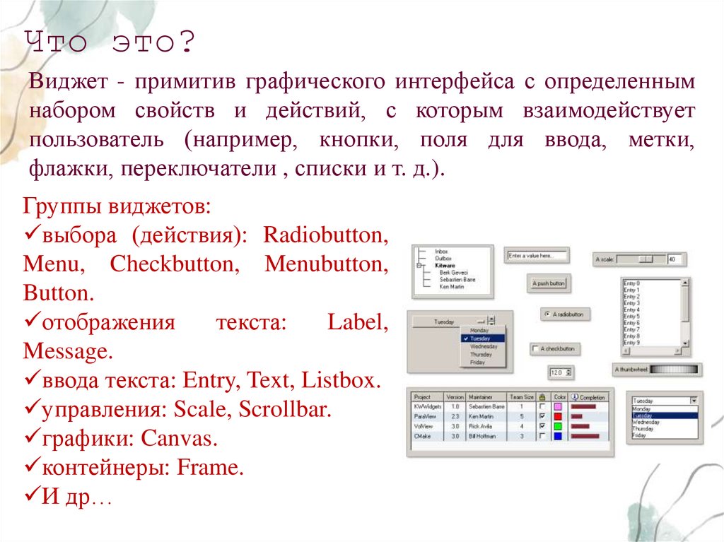 поле ввода, полоса прокрутки, меню, чекбокс, выпадающий