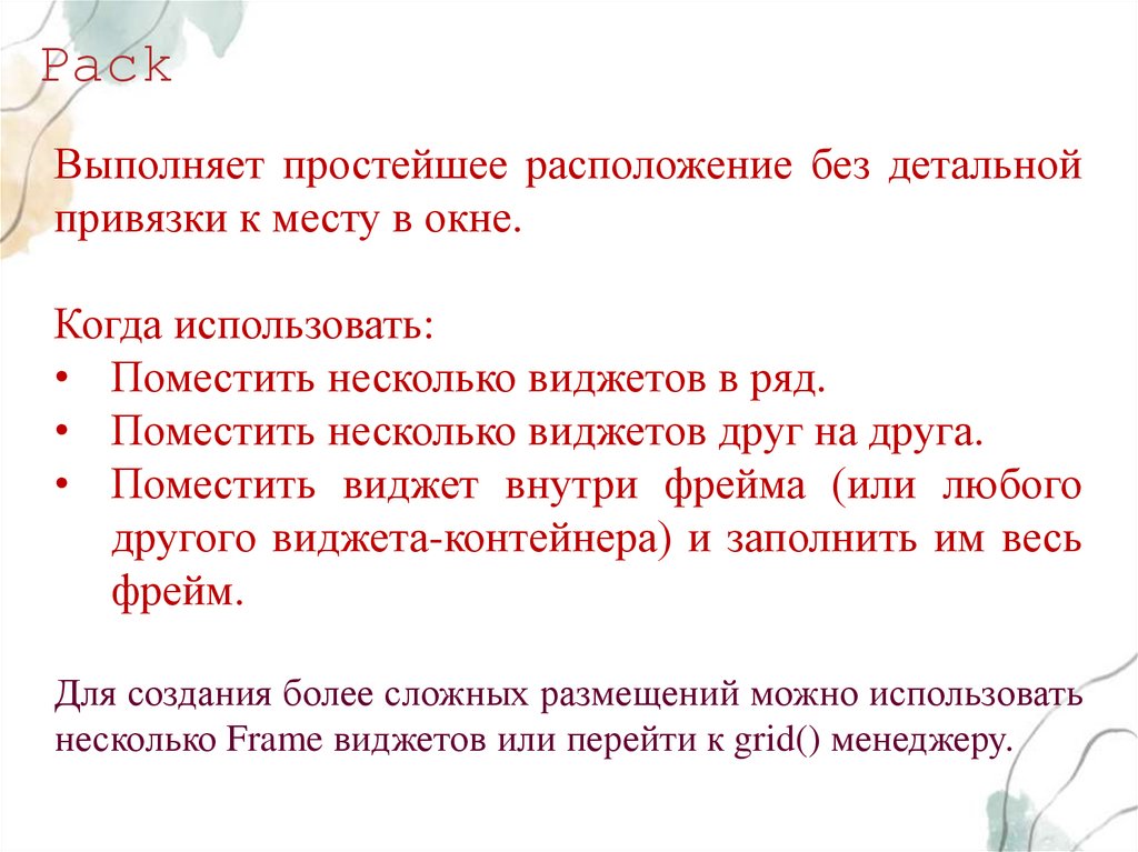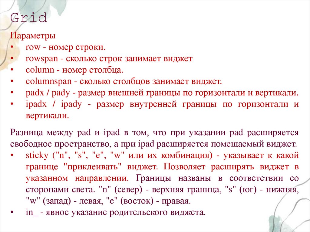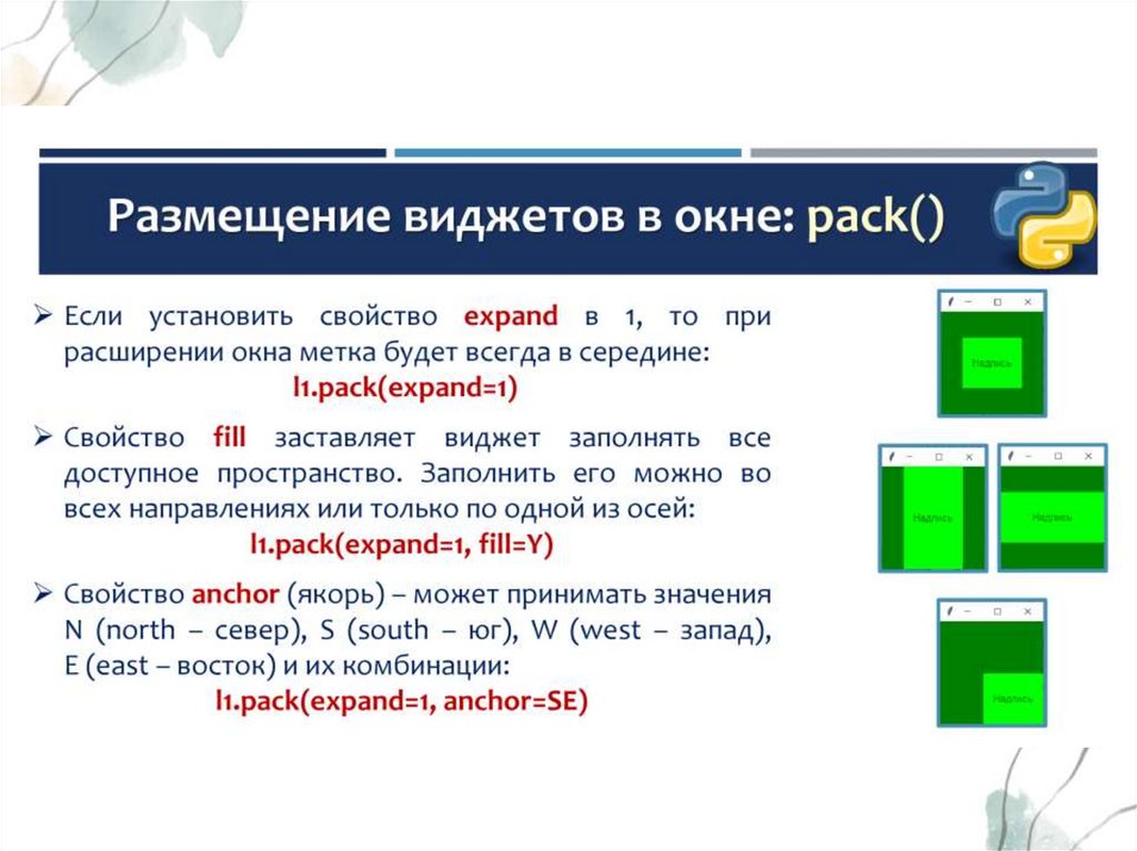 • anchor ("n", "s", "e", "w", "ne", "nw", "se", "sw" или "center") какой угол или сторона размещаемого виджета будет