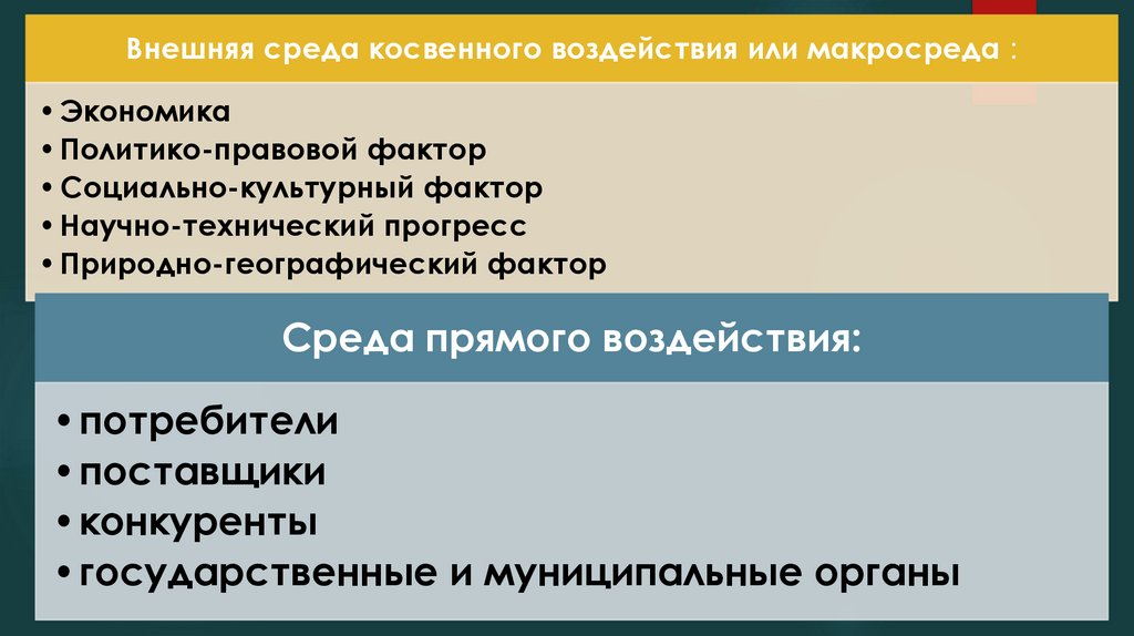 Внешняя среда подразделяется на среду косвенного воздействия (макросреду)и среду прямого воздействия (непосредственное окружение)