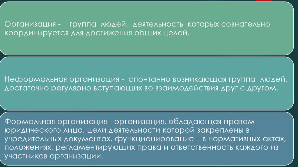 Организация - группа людей, деятельность которых сознательнокоординируется для достижения общих целей.