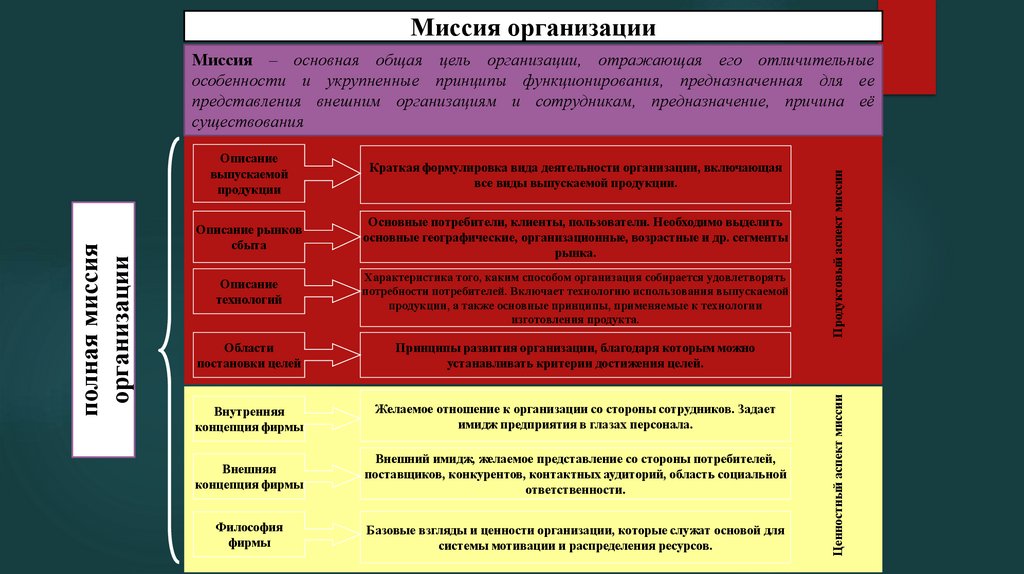 Миссия организацииКраткая формулировка вида деятельности организации, включающая
