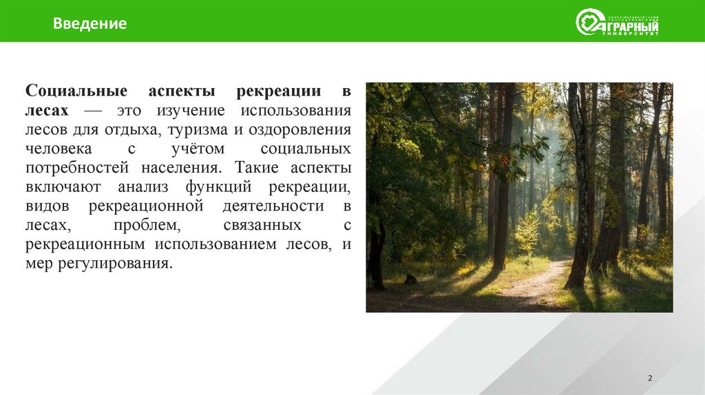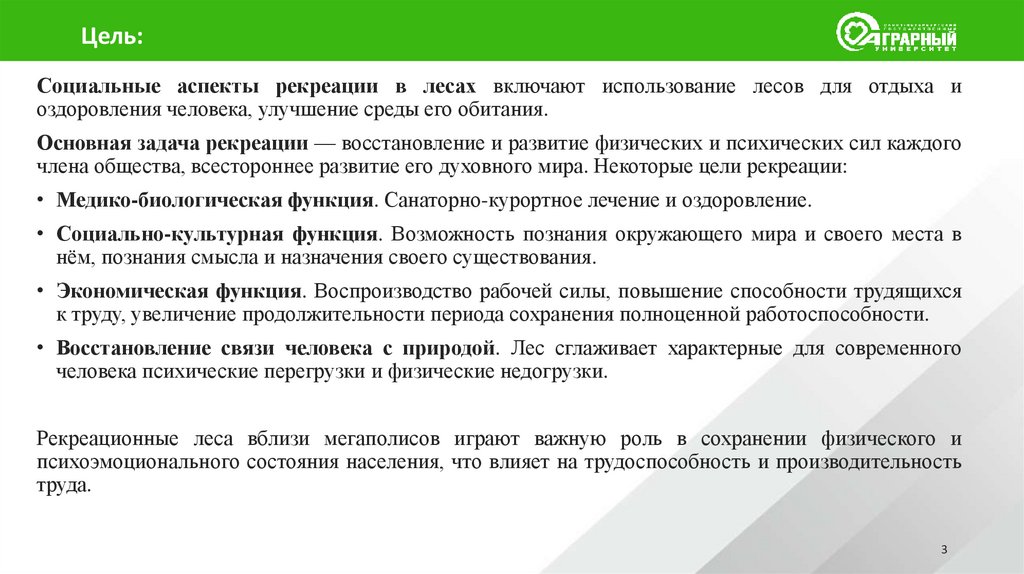 Цель:Социальные аспекты рекреации в лесах включают использование лесов для отдыха и