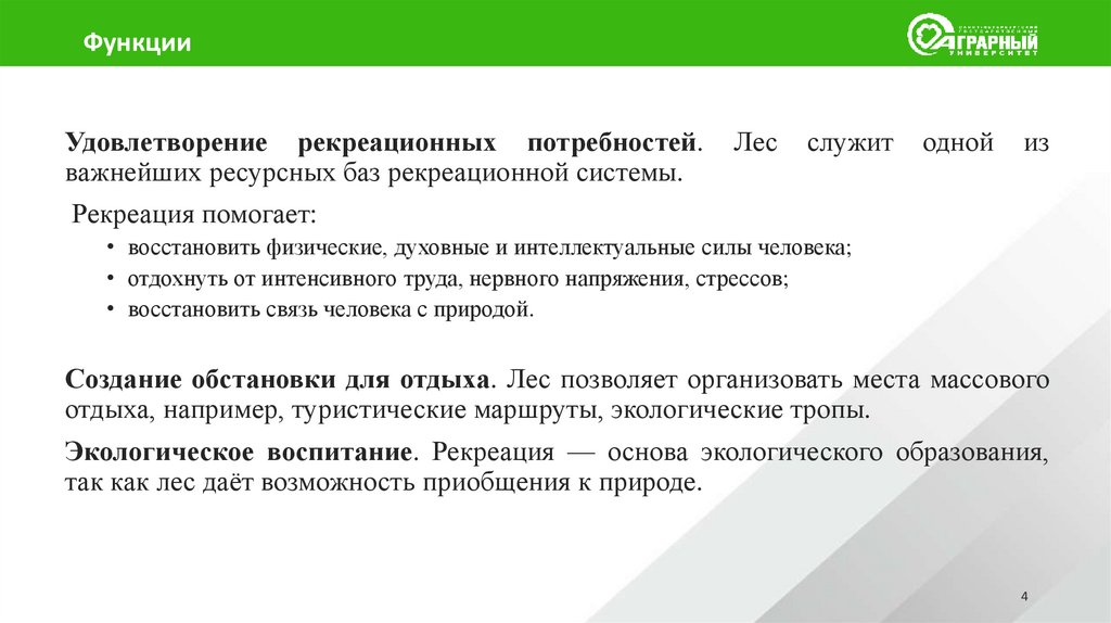 • Рекреация в лесах играет важную роль не только в восстановлении физического и