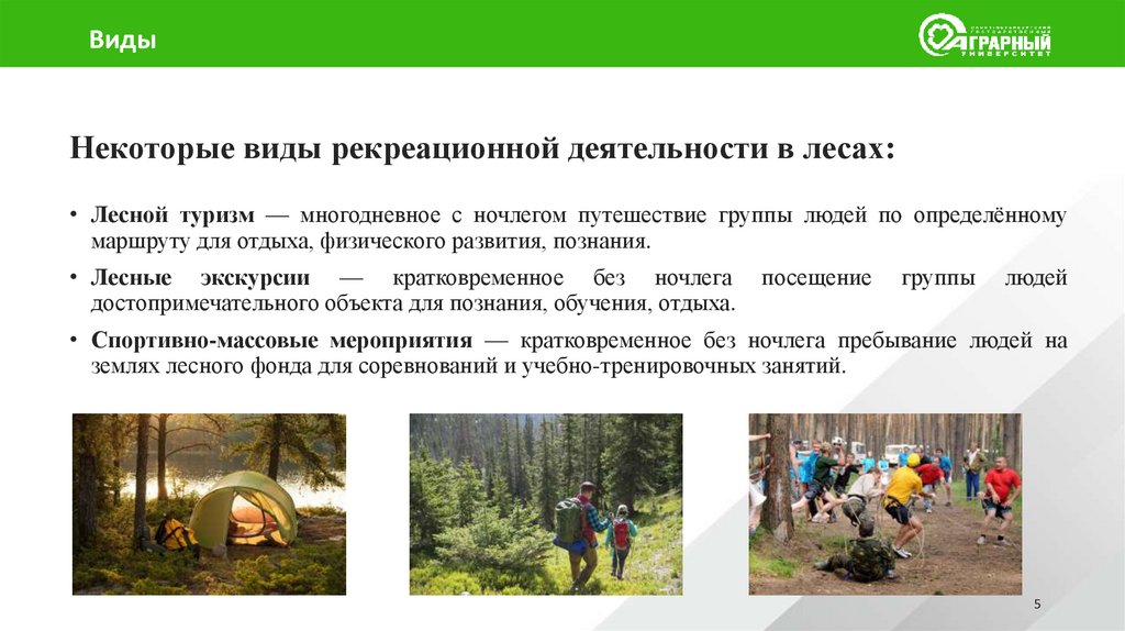 ВидыНекоторые виды рекреационной деятельности в лесах: