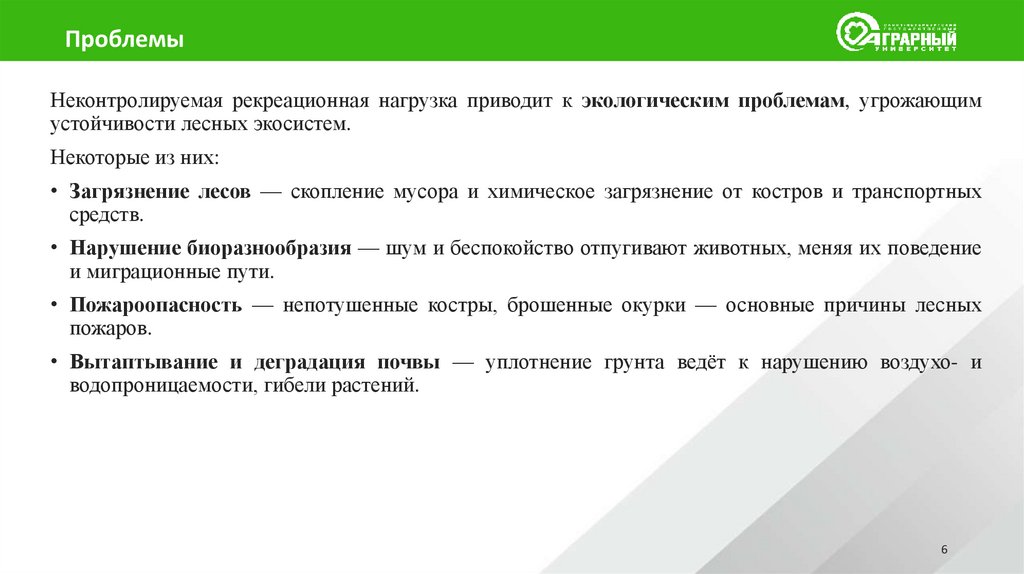 • Загрязнение лесов — скопление мусора и химическое загрязнение от костров и транспортных