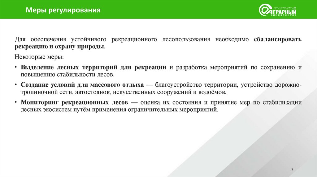 Меры регулированияДля обеспечения устойчивого рекреационного лесопользования необходимо сбалансировать