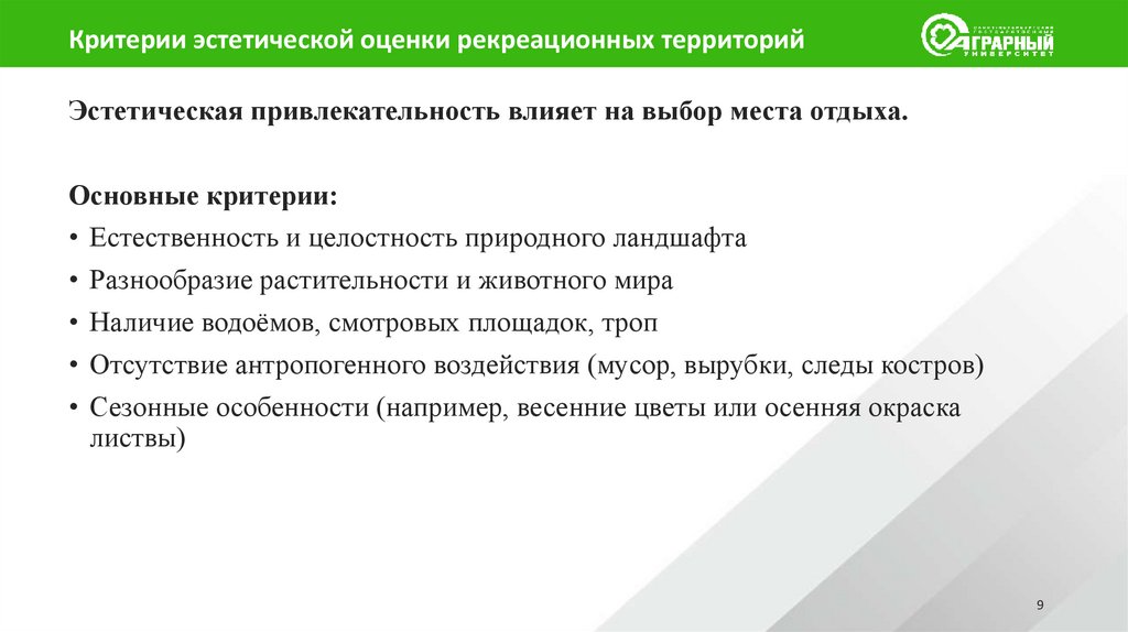 Критерии эстетической оценки рекреационных территорийЭстетическая привлекательность влияет на выбор места отдыха.