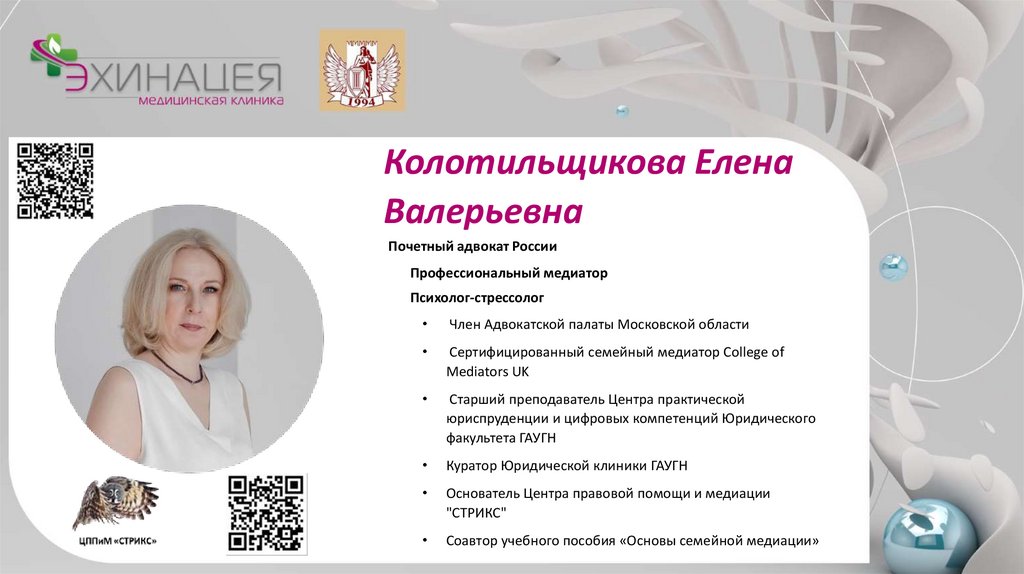 Почетный адвокат России, профессиональный медиатор, психолог-стрессолог