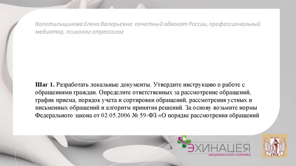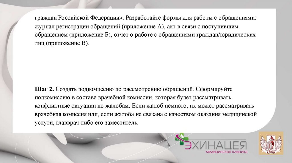 1. Назначьте ответственного за рассмотрение обращения. Ориентируйтесь на профиль вопросов: хирургическая, терапевтическая по мощь, экспертная