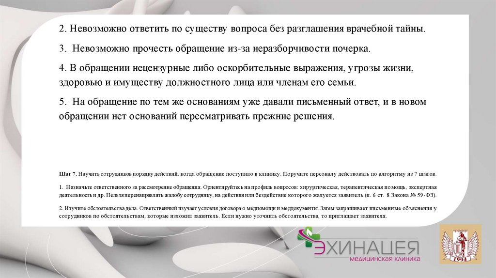 Шаг 7. Научить сотрудников порядку действий, когда обращение поступило в клинику. Поручите персоналу действовать по алгоритму из 7 ш агов.