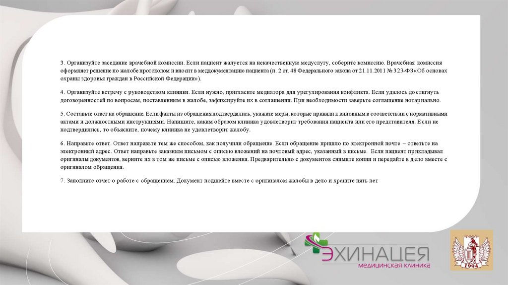 3. Организуйте заседание врачебной комиссии. Если пациент жалуется на некачественную медуслугу, соберите комиссию. Врачебная комиссияоформляет решение по жалобе протоколом и вносит в меддокументацию пациента (п. 2 ст. 48 Федерального закона от 21.11.2011 № 3 23-ФЗ «Об основах