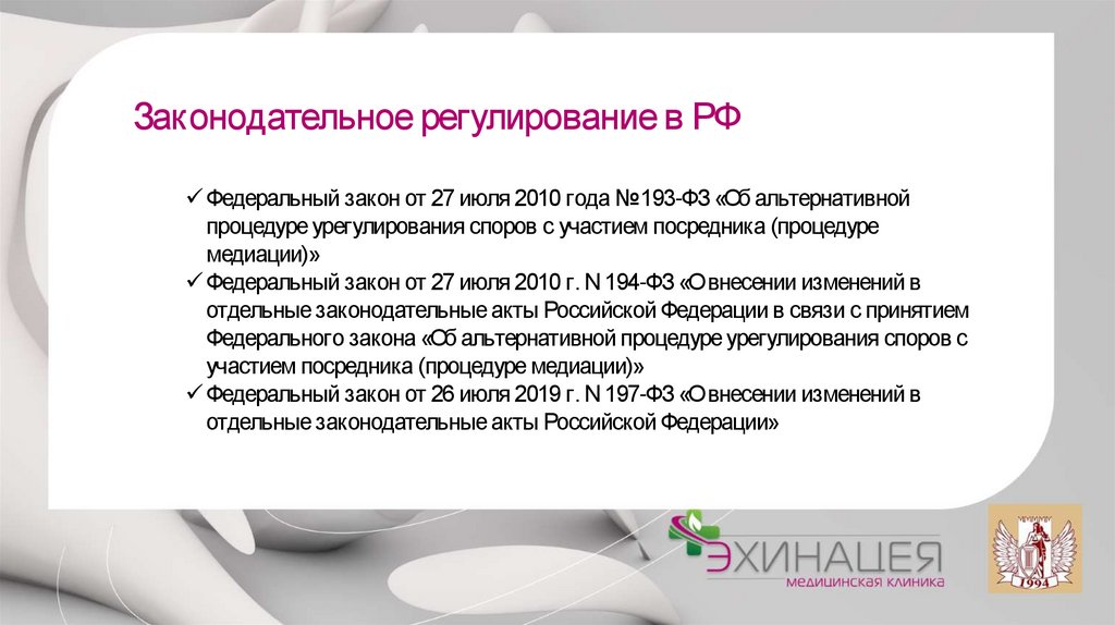 Законодательное регулирование в РФФедеральный закон от 27 июля 2010 года № 193-ФЗ «Об альтернативной