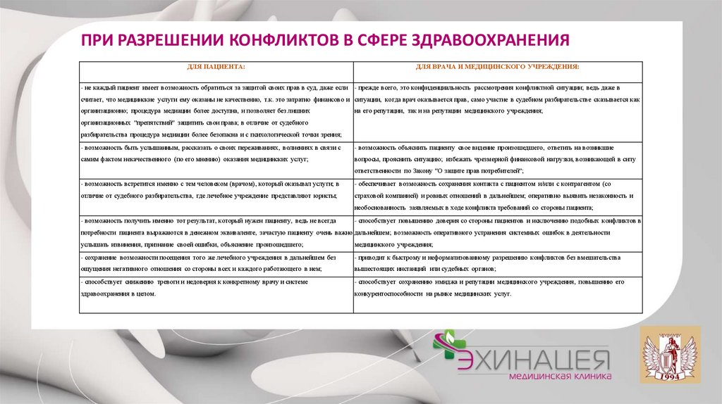 ПРИ РАЗРЕШЕНИИ КОНФЛИКТОВ В СФЕРЕ ЗДРАВООХРАНЕНИЯДЛЯ ПАЦИЕНТА: