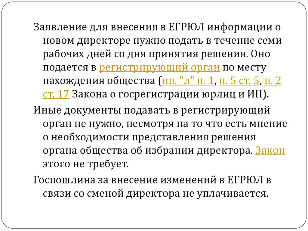 Заявление для внесения в ЕГРЮЛ информации оновом директоре нужно подать в течение семи