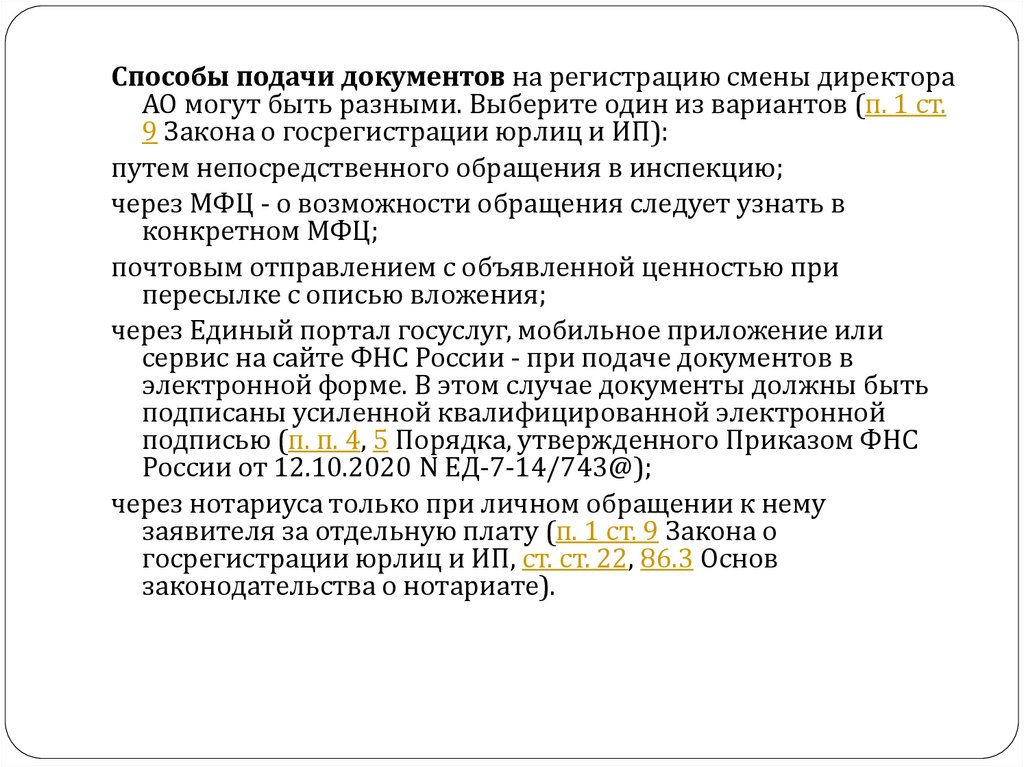 Способы подачи документов на регистрацию смены директораАО могут быть разными. Выберите один из вариантов (п. 1 ст.