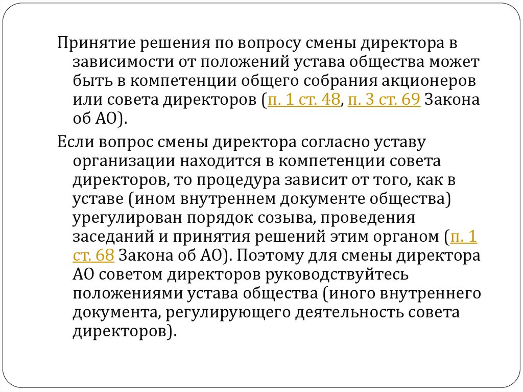 Принятие решения по вопросу смены директора взависимости от положений устава общества может