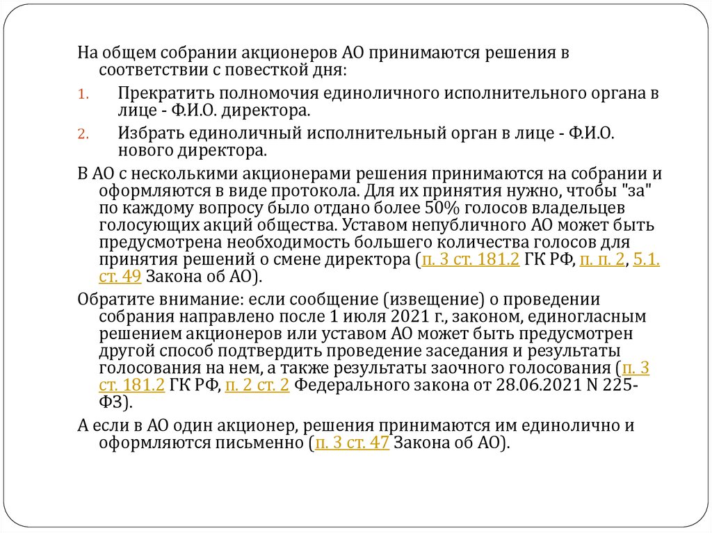 9. Как принять на общем собрании акционеров решение о смене директора АО