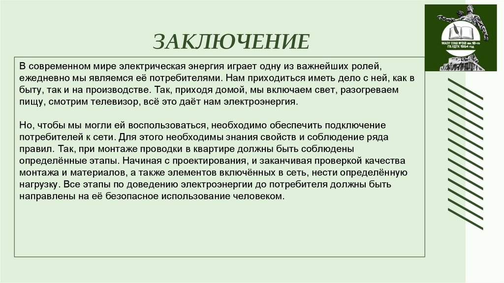 ЗАКЛЮЧЕНИЕВ современном мире электрическая энергия играет одну из важнейших ролей,