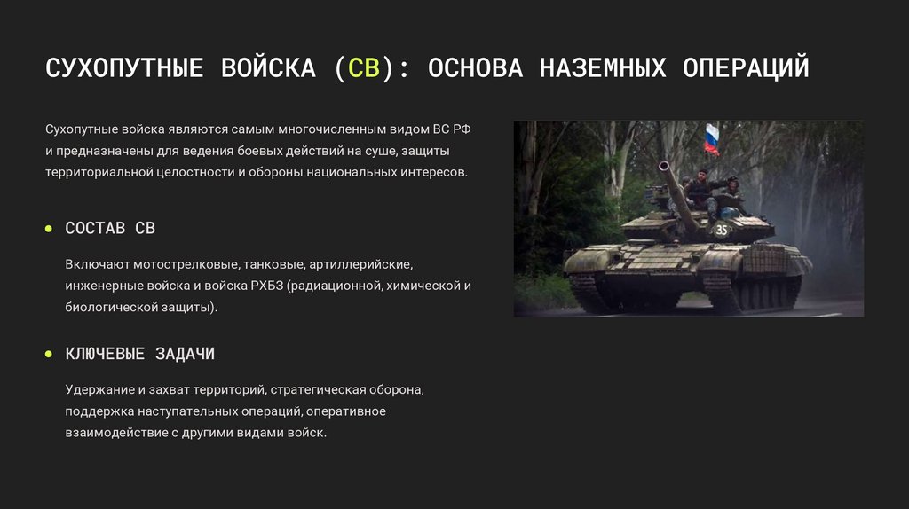СУХОПУТНЫЕ ВОЙСКА (СВ): ОСНОВА НАЗЕМНЫХ ОПЕРАЦИЙСухопутные войска являются самым многочисленным видом ВС РФ