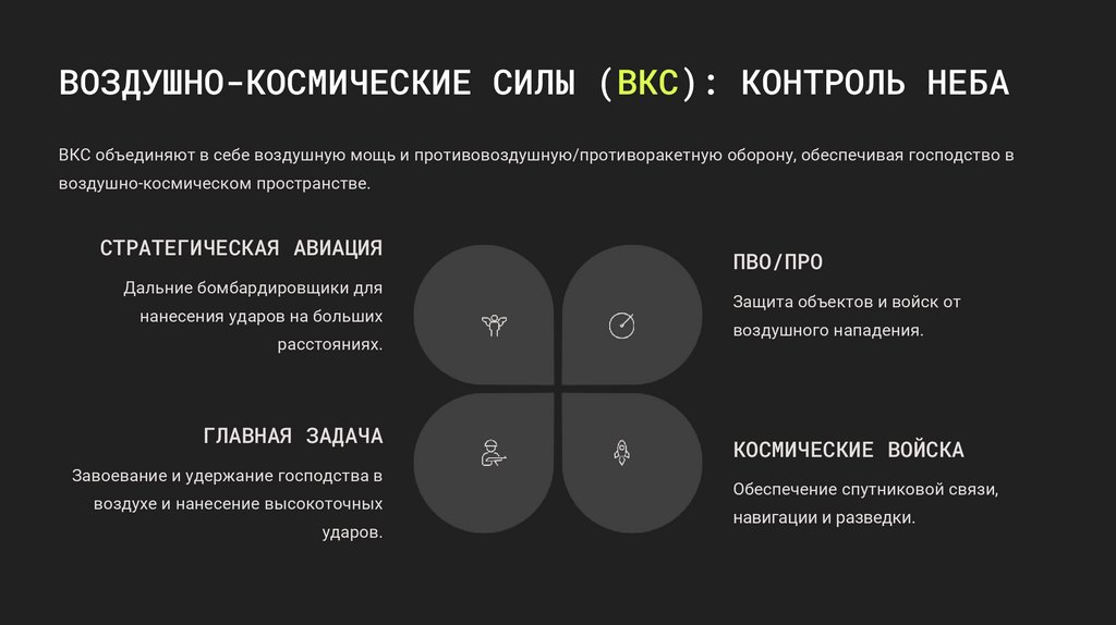 ВОЗДУШНО-КОСМИЧЕСКИЕ СИЛЫ (ВКС): КОНТРОЛЬ НЕБАВКС объединяют в себе воздушную мощь и противовоздушную/противоракетную оборону, обеспечивая господство в
