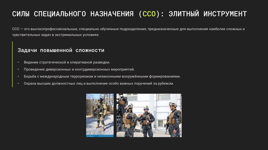 СИЛЫ СПЕЦИАЛЬНОГО НАЗНАЧЕНИЯ (ССО): ЭЛИТНЫЙ ИНСТРУМЕНТССО — это высокопрофессиональные, специально обученные подразделения, предназначенные для выполнения наиболее сложных и