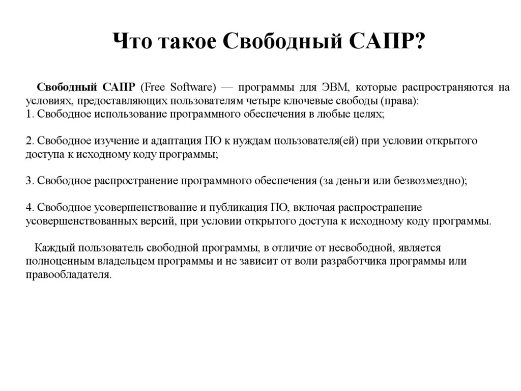 Что такое Свободный САПР?Свободный САПР (Free Software) — программы для ЭВМ, которые распространяются на