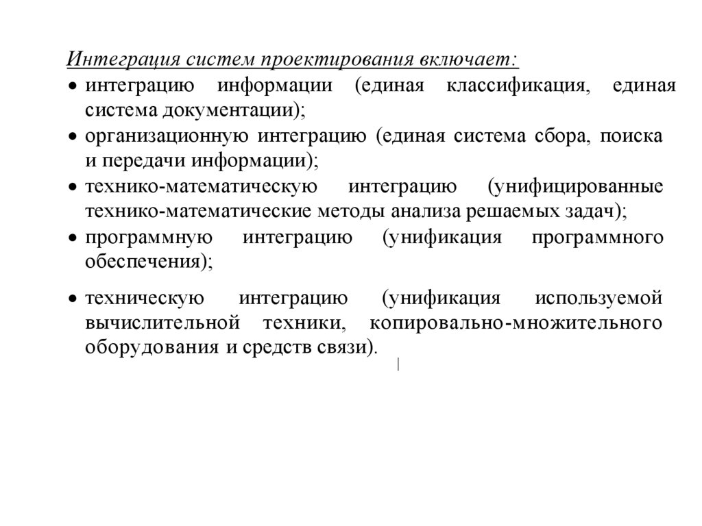 Интеграция систем проектирования включает:интеграцию информации (единая классификация, единая