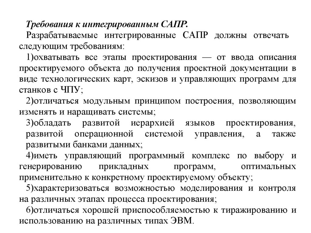 Требования к интегрированным САПР.Разрабатываемые интегрированные САПР должны отвечать