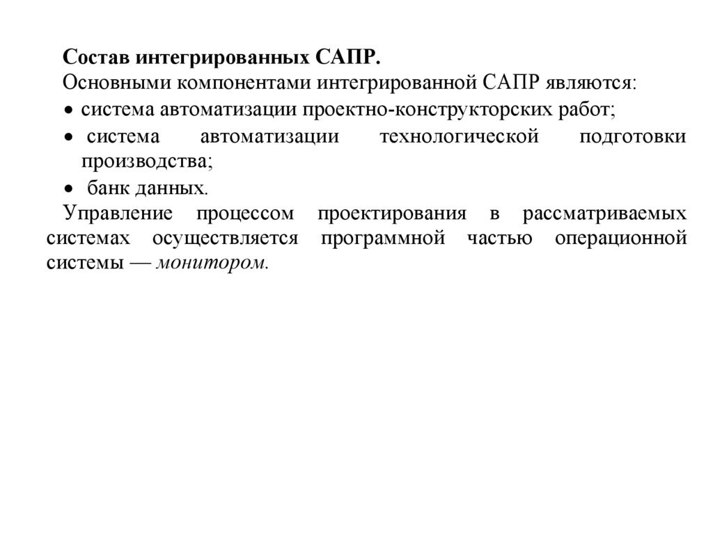 Состав интегрированных САПР.Основными компонентами интегрированной САПР являются: