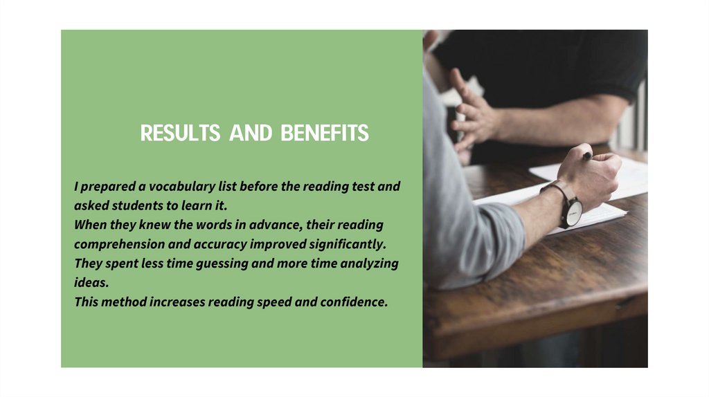 RESULTS AND BENEFITSI prepared a vocabulary list before the reading test and