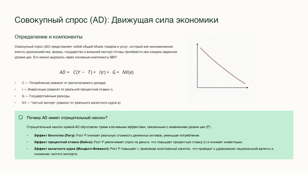 Отрицательный наклон кривой AD обусловлен тремя ключевыми эффектами, связанными с изменением уровня цен (P):