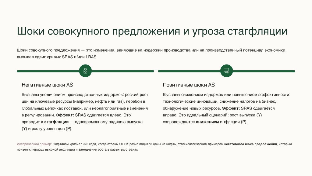 Исторический пример: Нефтяной кризис 1973 года, когда страны ОПЕК резко подняли цены на нефть, стал классическим примером негативного шока предложения, который