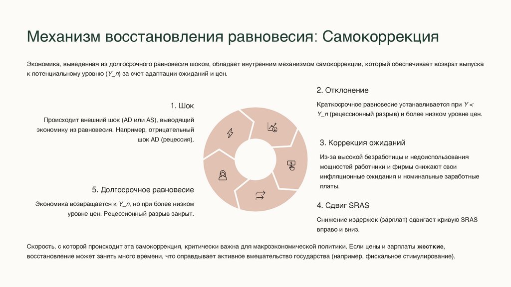 Механизм восстановления равновесия: СамокоррекцияЭкономика, выведенная из долгосрочного равновесия шоком, обладает внутренним механизмом самокоррекции, который обеспечивает возврат выпуска