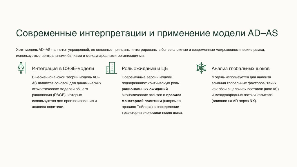 Современные интерпретации и применение модели AD–ASХотя модель AD–AS является упрощенной, ее основные принципы интегрированы в более сложные и современные макроэкономические рамки,