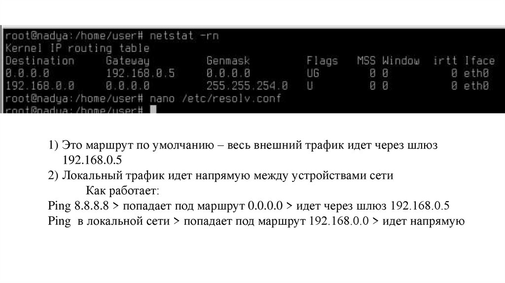 1) Это маршрут по умолчанию – весь внешний трафик идет через шлюз192.168.0.5