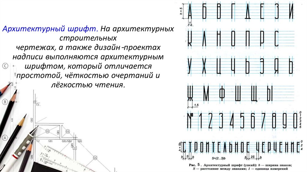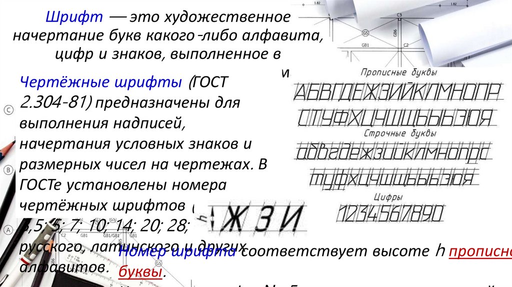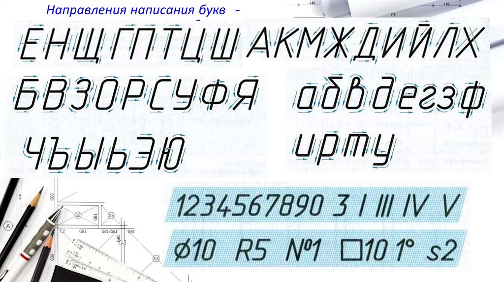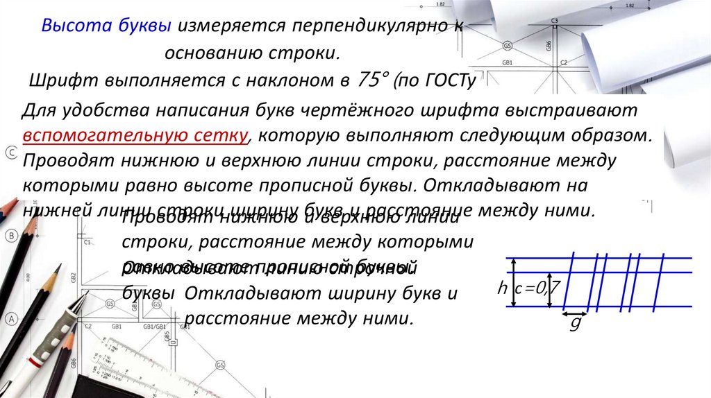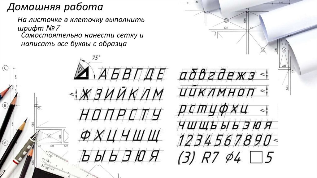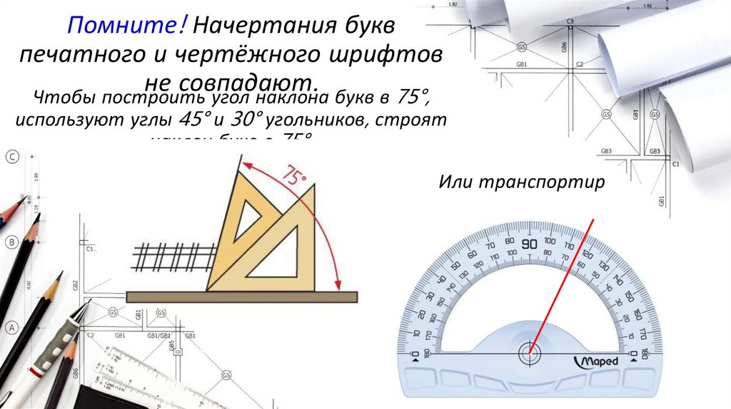 Шрифт выполняется с наклоном в 75° (по ГОСТу