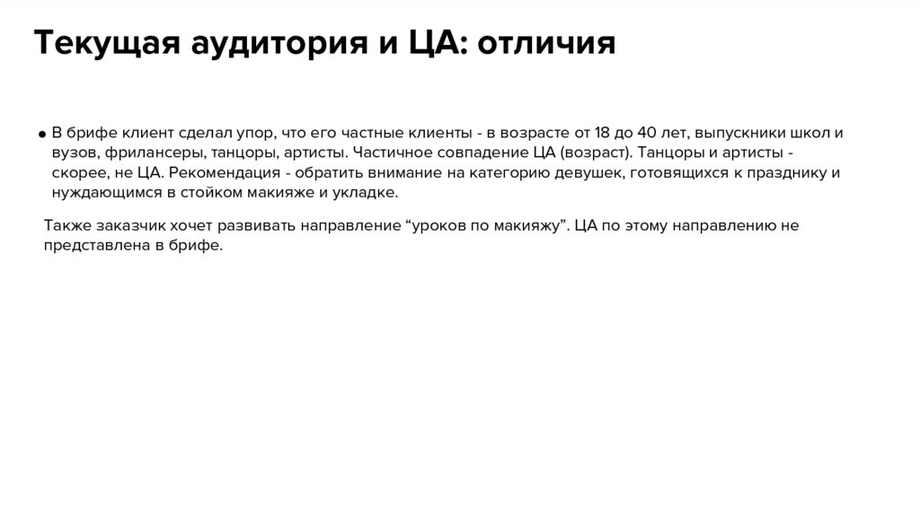 Текущая аудитория и ЦА: отличия● В брифе клиент сделал упор, что его частные клиенты - в возрасте от 18 до 40 лет, выпускники школ и